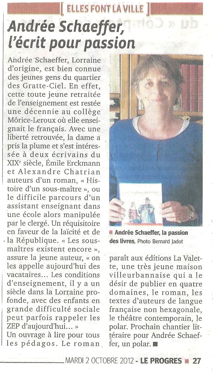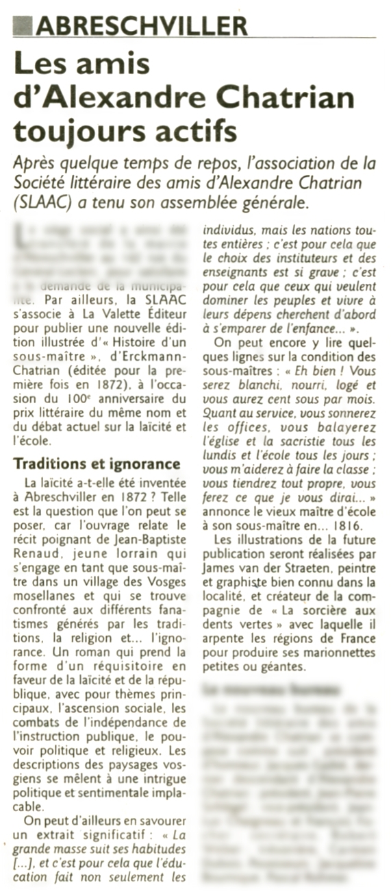 Avec la rentrée, la réforme de l’école ressurgit. Et si les éléments de débats étaient à piocher dans le passé ? C’est ce que propose la jeune maison d’édition Lavalette, implantée en Moselle à Abreschviller, sur le modèle d’Acte Sud ( implantation locale, publication tout type). Elle réédite Histoire d’un sous-maître, écrit par les Mosellans Erckmann et Chatrian en 1872, qui signaient sous un même pseudonyme « Erckmann-Chatrian ». « Le roman raconte les mésaventures d’un jeune enseignant en 1816, explique l’éditeur Jean-Marie Schlégel. Jean-Baptiste Renaud est un humaniste laïque. Il trouve une place auprès d’un maître d’Abreschviller, mais déchante vite. Il se retrouve pris dans le cloisonnement de l’enseignement religieux ». Plus qu’un débat sur la laïcité, c’est un ouvrage sur la qualité de l’enseignement. Le héros est avant tout un sous-maître compétent. « Ce n’est pas un bouffeur de curé, précise l’éditeur. Jean-Baptiste a juste une idée précise de son métier. Il ne comprend pas l’importance des dogmes conceptuels et religieux. C’est un pragmatique : l’école doit former des citoyens éclairés et parés pour affronter la vie. Une mission d’autant plus essentielle vis-à-vis des masses populaires. »